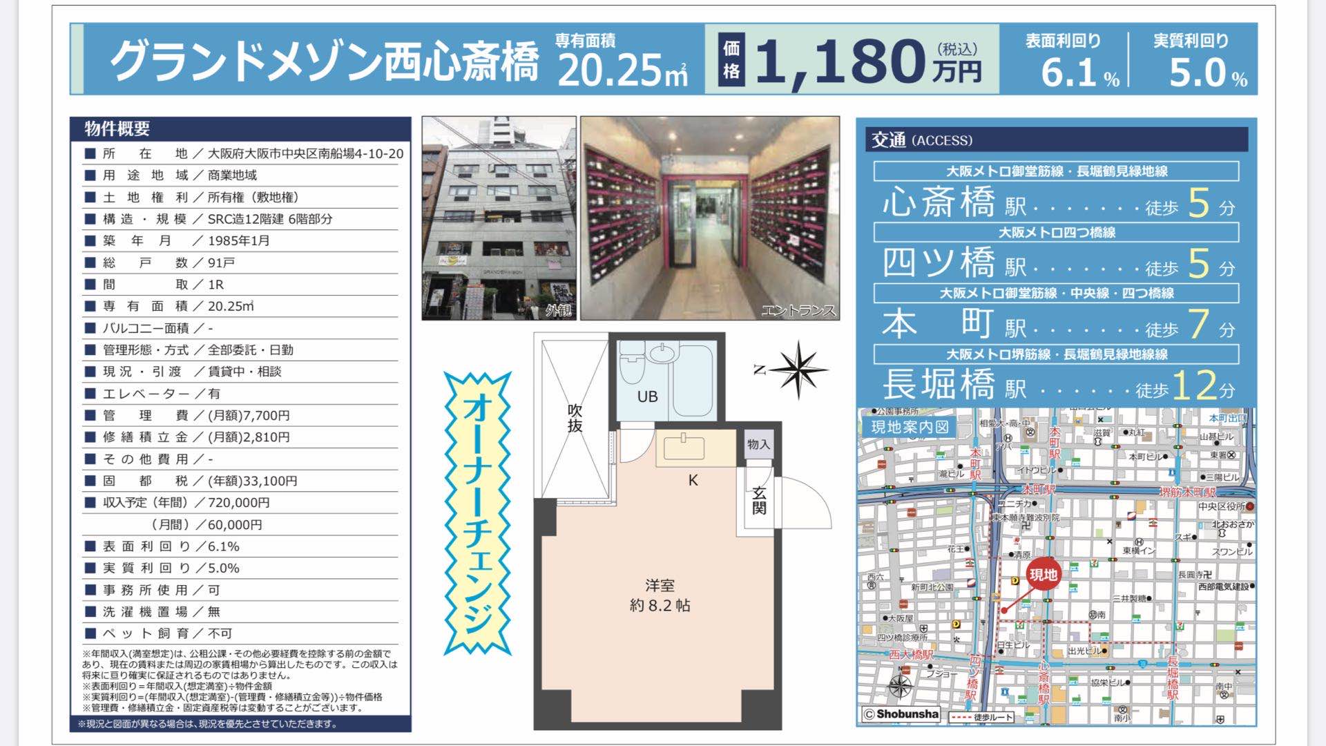 位于大阪市中央区南船场4丁目。位置优越,交通便利,升值率较高。周边配套设施完善,购物中心、饮食店、公园、邮局、超市、学校、车站、医院等均步行可到达。