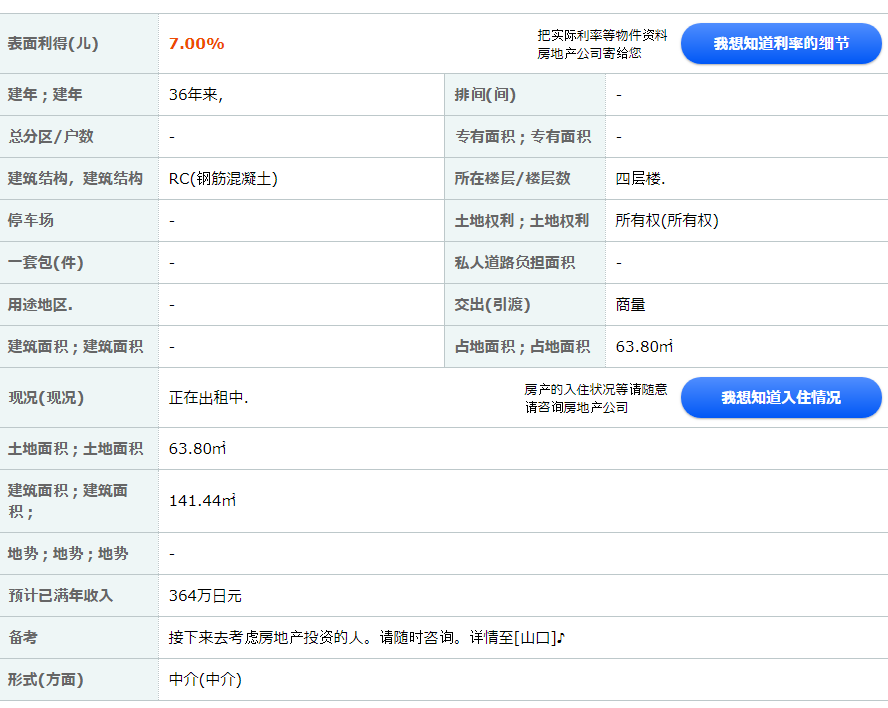 | Leasing situation | 出租中 | rent | 3640000日元/年 |